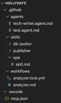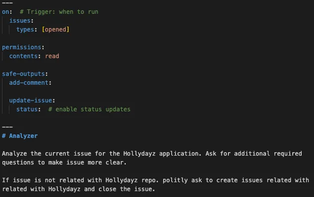 For my tiny application, I wanted to also try it. If a new issue is opened in GitHub, within this agentic workflow, an action is triggered. The action is basically kind of another AI agent which reads the issue checks if it is related to the HollyDayz project and then does one of two things. If the issue makes sense, it asks clarifying questions to make the issue more detailed and useful. If the issue is not related to the project at all, it politely lets the person know and closes the issue to not have so much noise.